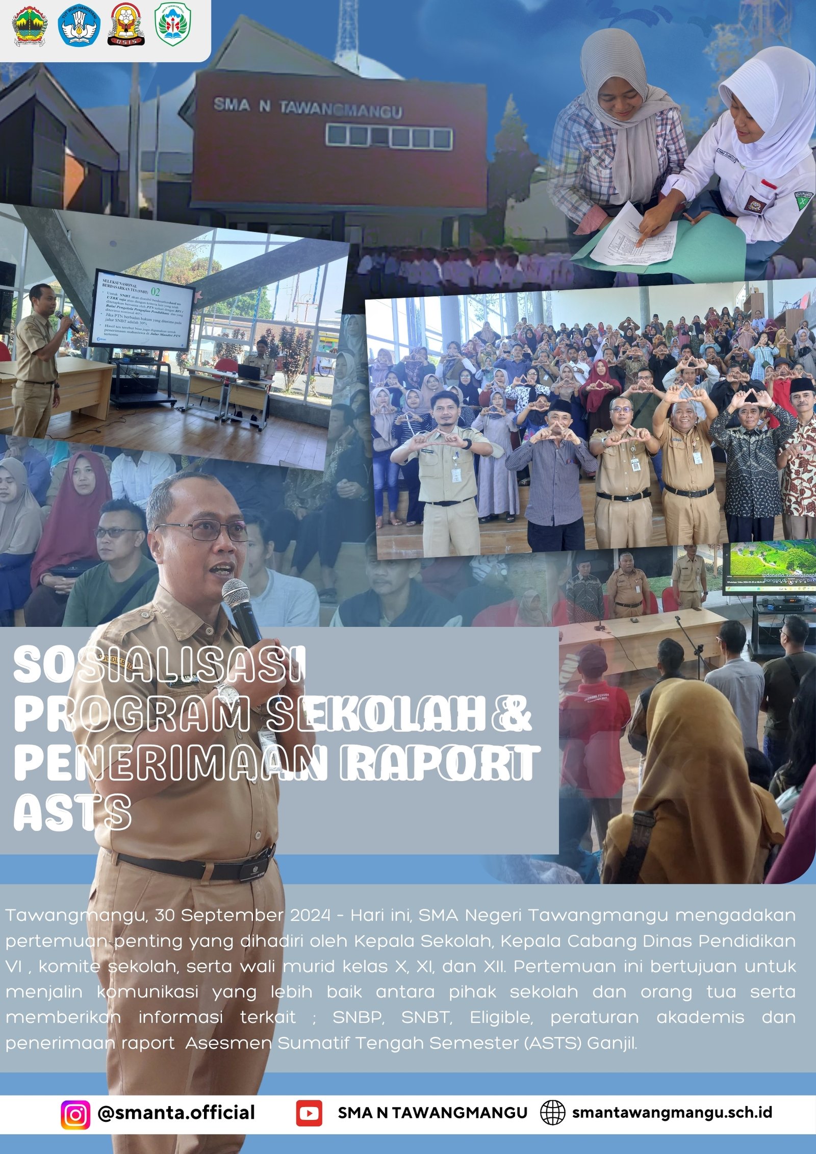 Tawangmangu, 30 September 2024 – SMAN Tawangmangu mengadakan acara sosialisasi program sekolah dan penerimaan raport untuk kelas X, XI, dan XII pada hari Senin (30/09). Acara yang diadakan di ruang Galeri sekolah ini dihadiri oleh Kepala Sekolah, Bapak Bangun Sartono, S.Pd., M.Si, serta Pengawas Sekolah Wilayah VI, Bapak Tri Hartanto, S.Pd., M.Pd. Selain itu, Komite…