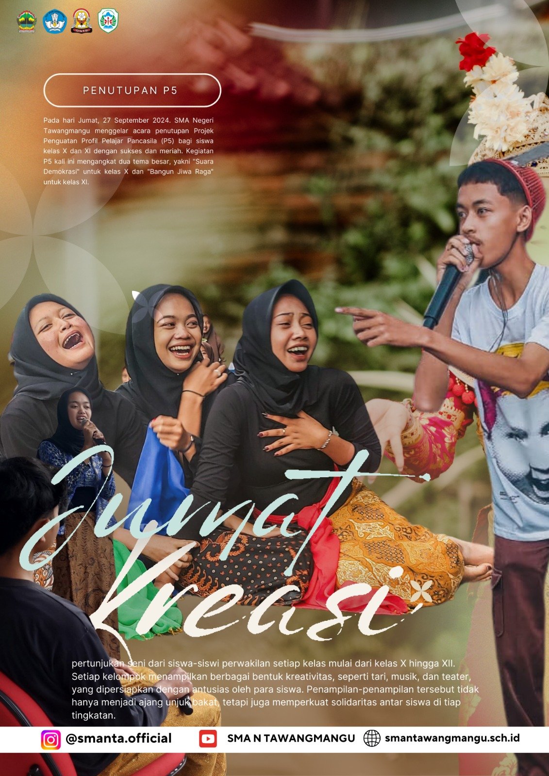 SMAN Tawangmangu baru saja menggelar penutupan Program Penguatan Profil Pelajar Pancasila (P5) dengan meriah, Senin (7/10). Acara tersebut dimeriahkan dengan beragam persembahan seni dari para siswa, pemberian penghargaan lomba, serta pemilihan ketua OSIS yang baru. Acara dimulai dengan penampilan tari tradisional yang memukau dari siswa-siswi kelas XI, sebagai bentuk penghormatan pada budaya Indonesia. Tari ini…