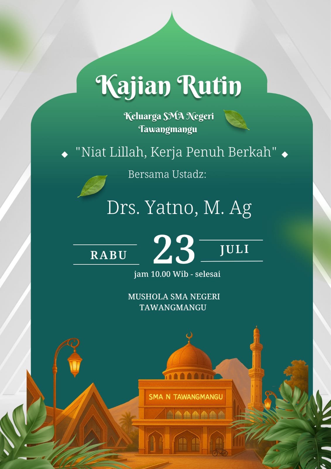Pengajian rutin ini menjadi sarana efektif untuk membangun karakter siswa yang religius dan berakhlak mulia, sejalan dengan visi SMAN Tawangmangu dalam mencetak generasi yang tidak hanya cerdas secara akademik, tetapi juga memiliki kecerdasan spiritual dan emosional.