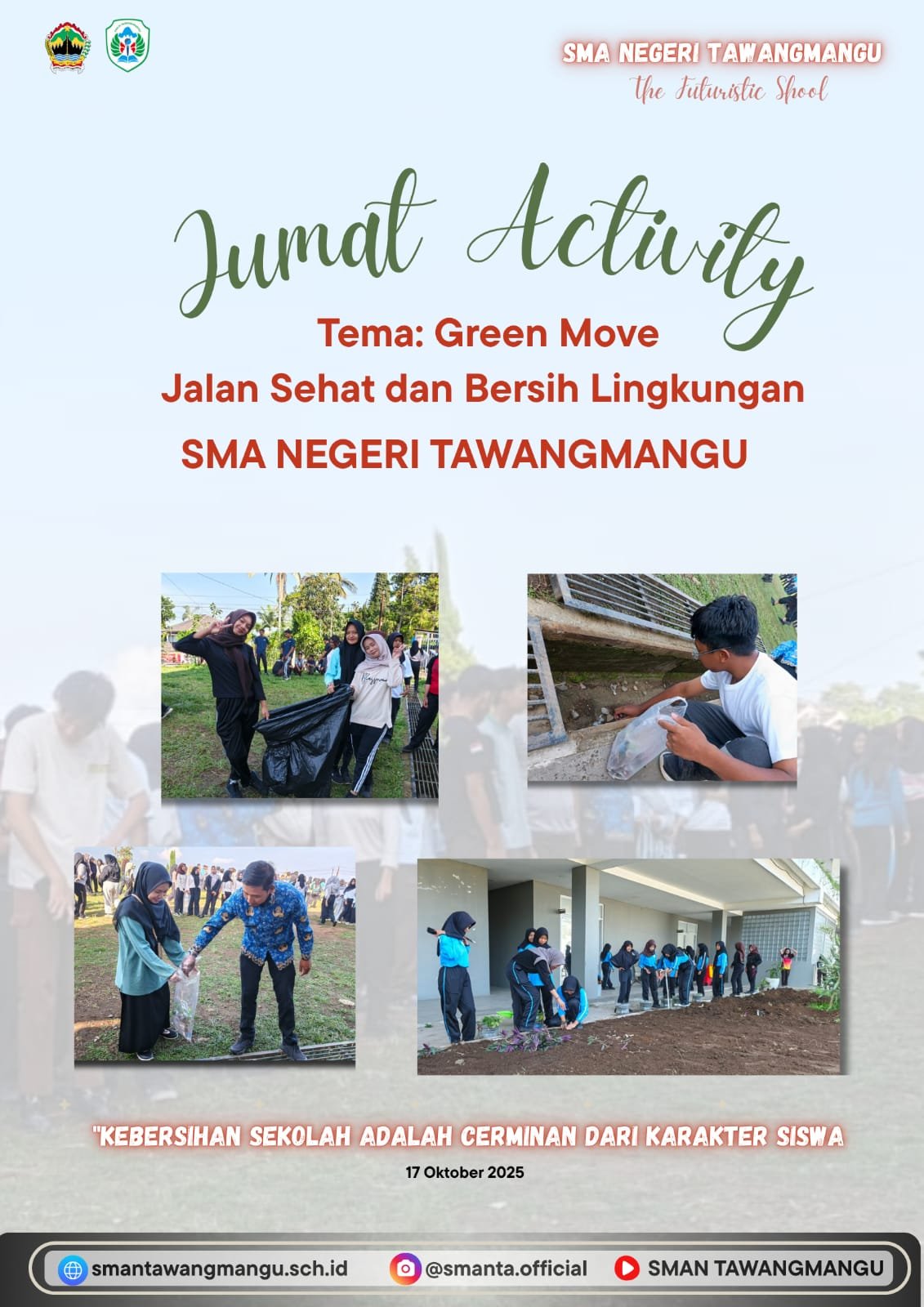 Read MoreTawangmangu, 17 Oktober 2025 – SMA Negeri Tawangmangu kembali melaksanakan kegiatan rutin Jumat Activity dengan tema “Green Move: Jalan Sehat dan Bersih Lingkungan.”Kegiatan ini diikuti oleh seluruh guru, staf, dan siswa sebagai bentuk kepedulian terhadap kesehatan dan kebersihan lingkungan sekolah. Acara dimulai dengan jalan sehat bersama di sekitar area sekolah, yang bertujuan untuk menjaga kebugaran…